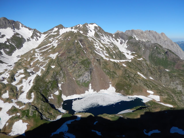En haut à droite, le pic de Géougue d'Arre 2619 m que je vais bientôt faire et en dessous, le lac du Lavedan 2179 m.
